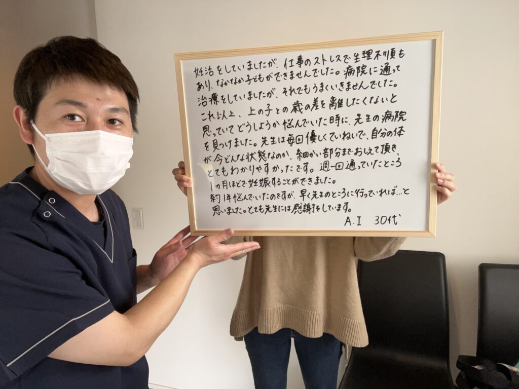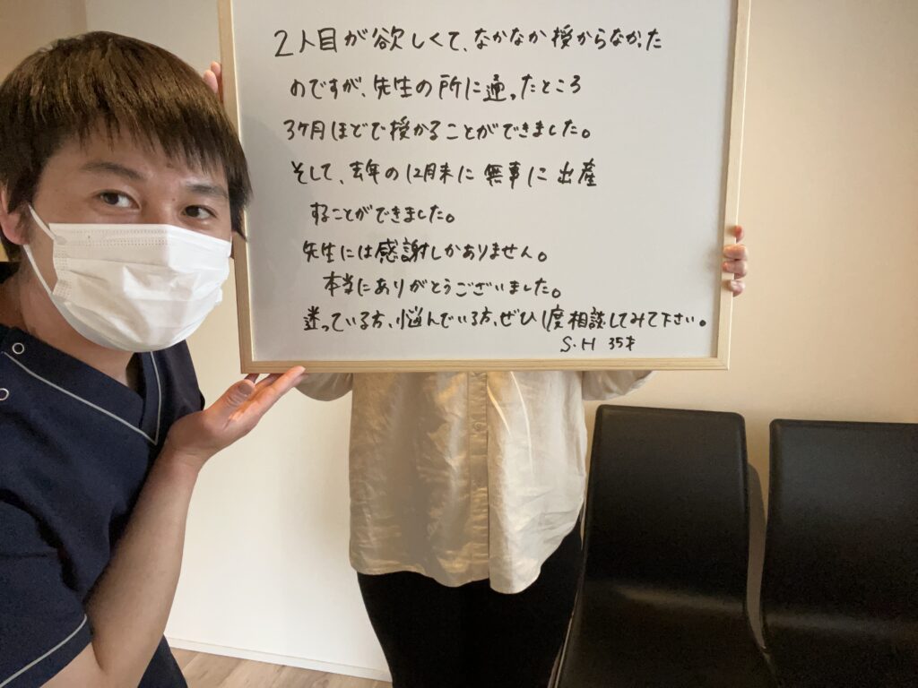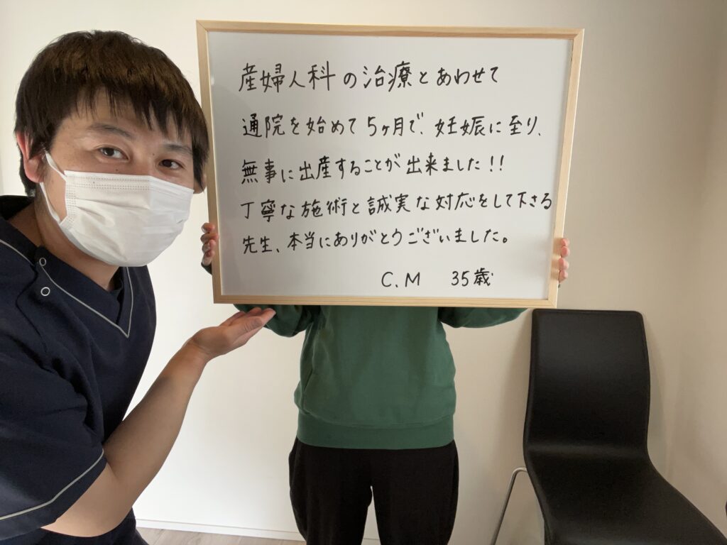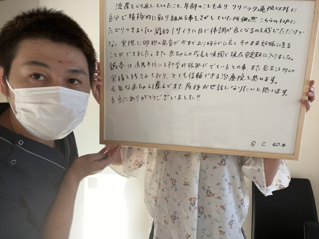 通ってから実際に卵胞の発育が今までよりも明らかに良く、そのまま妊娠に至ることができました。赤ちゃんの成長も順調で現在安定期に入りました。S.C様 40歳 女性 流産を繰り返していたこと、年齢のこともあり、クリニック通院以